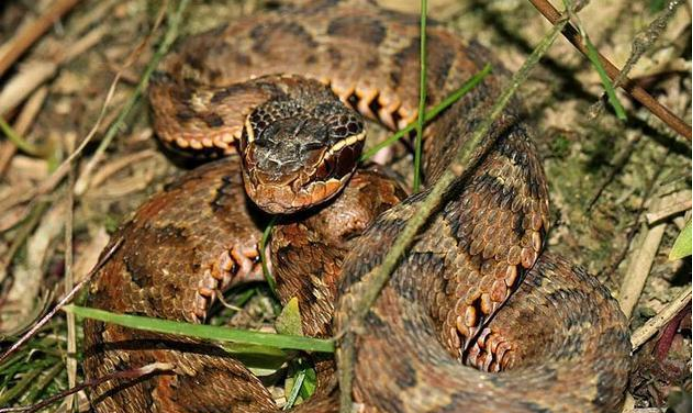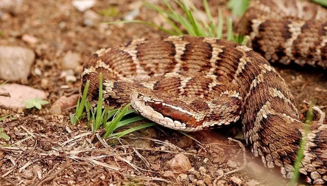 短尾蝮作为毒蛇,其毒液是最主要的防御武器。当遭遇威胁时,短尾蝮会首先发出警告信号。它会将身体盘成S形,头部抬高,颈部膨胀,同时发出“嘶嘶”的声音,试图吓退攻击者。这种姿态是短尾蝮向外界表明自己具有危险性的一种方式。如果警告无效,短尾蝮会毫不犹豫地发动攻击,将毒液注入对方体内。