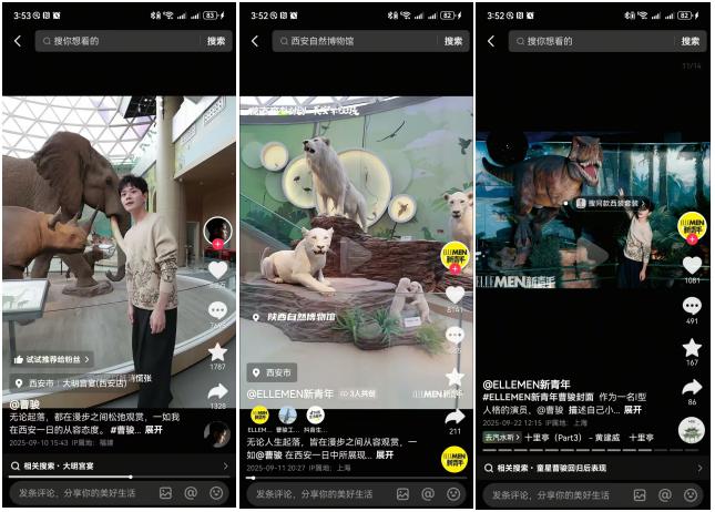 作为本次传播活动的核心场景,陕西自然博物馆的多元展陈资源成为镜头焦点。曹骏的拍摄足迹遍布馆内标志性展区:在史前探秘展厅与霸王龙隔空对话,于肯尼斯·贝林展馆与非洲象、白狮家族等700余件世界珍稀野生动物标本同框。九月期间,《ELLEMEN新青年》杂志携手演员曹骏及抖音生活服务官方账号陆续发布拍摄花絮及大片预告视频,这些融合自然之美与人文温度的画面,迅速成为社交平台热议话题。