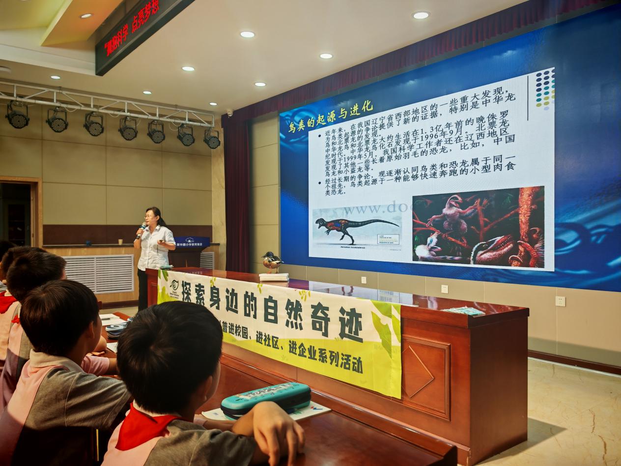 在全国科普月之际,9月11日下午,陕西自然博物馆走进翠华路小学,李银华老师给四年级近200位同学开展了一场《带你走进鸟的世界》专题讲座,从鸟的起源与进化、鸟的形态结构、鸟的分类、鸟和人类的关系等4个方面给孩子们上了一堂生动的科学课。李老师通过让同学们观察鸟类标本,引导孩子们发现问题、总结规律、解决问题。