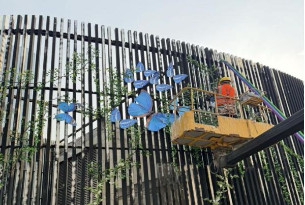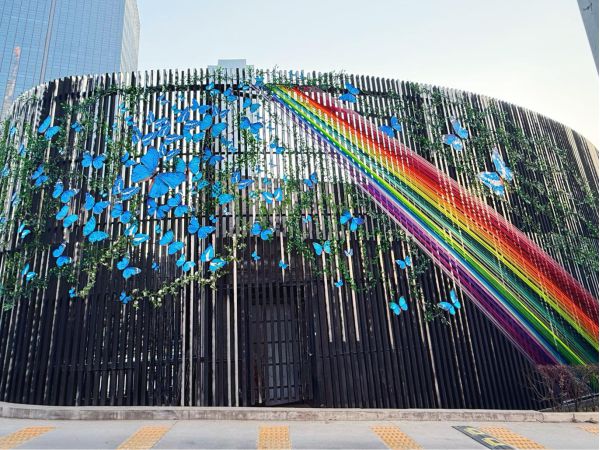 此次改造由展教一部牵头实施,通过在风亭黑色竖条外立面加装仿真绿植、错落布置蓝色彩蝶装饰,同时搭配一道绚丽的彩虹线条装置,将自然元素与艺术设计巧妙融合。从施工搭建到装饰收尾,工作人员细致打磨每一处细节,让冰冷的建筑结构焕发灵动生机。
