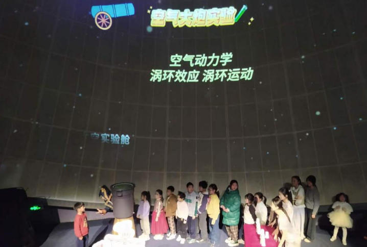 本次展演充分发挥穹幕影院的视听优势,将地球演化知识与趣味剧情深度融合。活动现场,范式起电机演示和空气大炮实验等互动环节最受孩子们欢迎。当小朋友们勇敢走上舞台,手触仪器后头发瞬间“炸毛”,憨态可掬的模样引得台下笑声不断;空气大炮射出的烟圈在穹幕下飘散,更是引发了阵阵惊叹。孩子们踊跃举手参与,现场气氛热烈,30天的连续演出秩序井然,收获了市民的广泛好评。