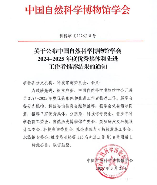 3月26日,中国自然科学博物馆学会正式公布2024—2025年度优秀集体和先进工作者推荐结果,陕西自然博物馆凭借在行业发展、科普服务、社会责任等领域的亮眼表现获行业认可,馆长朱伟获“先进工作者”荣誉称号。