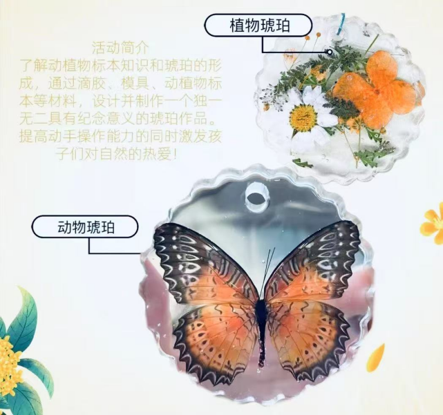 活动简介: | 学习动植物标本知识,并通过手工制作直观了解琥珀的形成过程,提高参与者的动手操作能力,激发他们对自然科学的热爱。先观看视频,熟悉琥珀的制作方法,再使用滴胶、模具、动植物标本等材料,设计并制作一个独一无二具有纪念意义的琥珀作品。 |